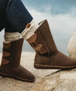 Our classic ‘Boshie’ in suede and knit back now available in wide width! The suede upper extends up the front of the shaft, with the knit down the back. Attractive branded BEARPAW® buckles add some extra flair. The height of this cozy boot is approximately 9 inches in the back, 10 inches in the front, measured from the base of the sole with a 14 inch circumference.