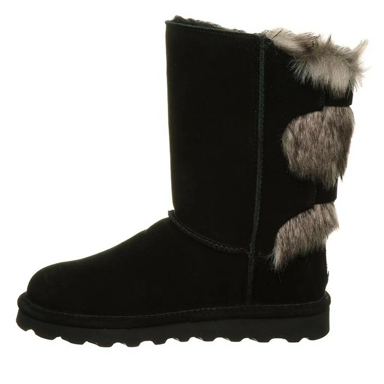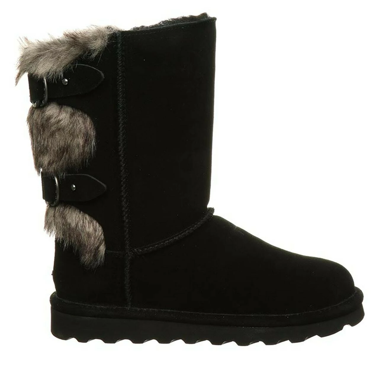 Double d-ring straps cinch the back of this smart wide width size suede boot on our new slimmer design construction with fuzzy faux fur or wool blend accented back panel. Treated with NeverWet® technology.
