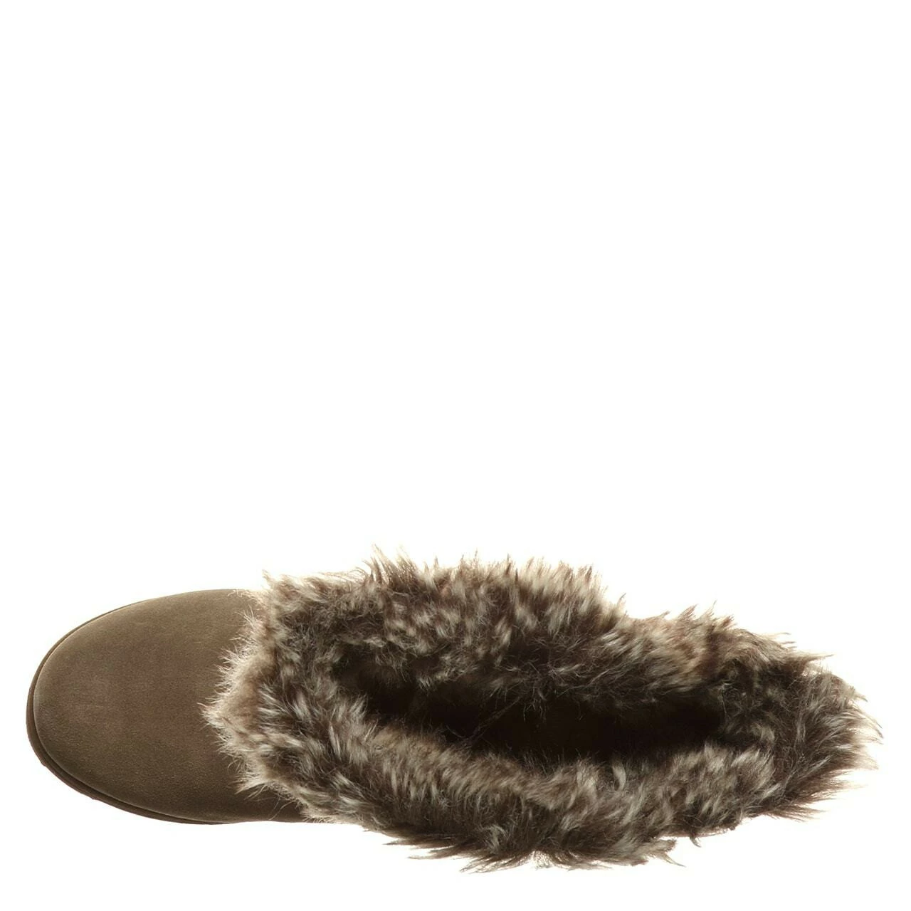 A touch of fluff gives detail and interest to the cozy Genevieve. This triple buckle with fur wrapped and elevated heel boot is designed to spruce up any fall wardrobe.