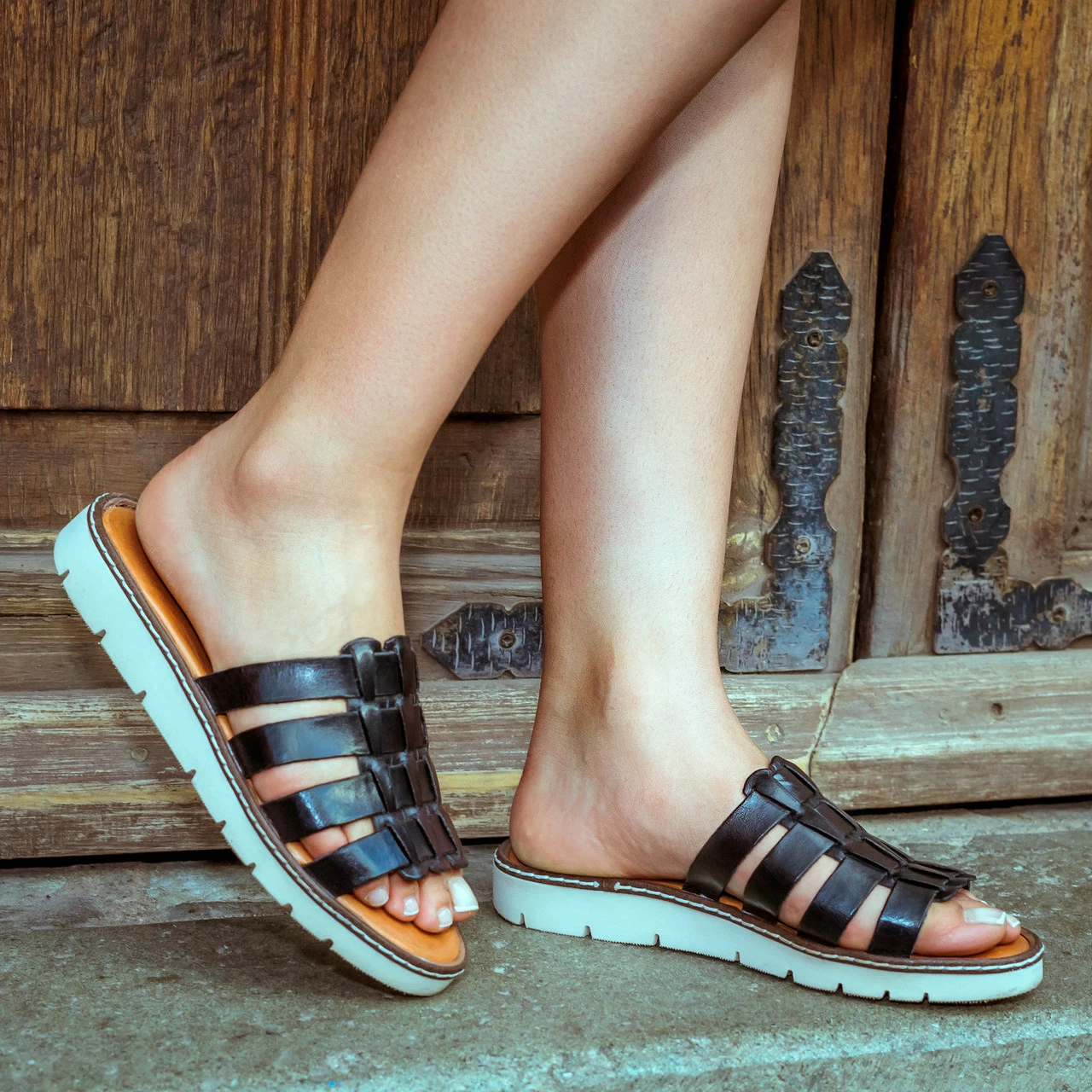 What says “quick and easy style” better than slide-on-and-go sandals? For the always active busy bee, this shoe inspired by the traditional Huarache style will have you out the door and on your way in no time. So, go ahead, grab your morning cup of joe (or drink of choice) and take on summer days with confidence and style. At the beach, in the office, or to the store, these hand crafted, braided leather slip-ons with sporty supportive bottoms will keep you on your feet while you do your thing.